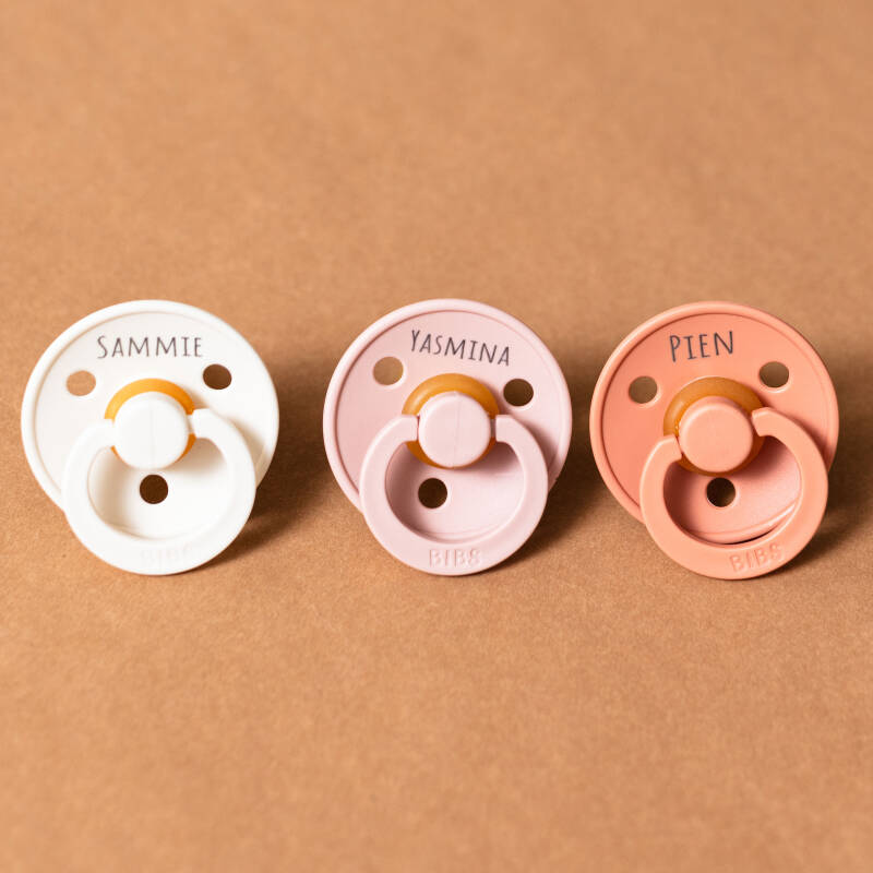 BIBS Fopspenen met naam? Dat kan! Kies je favoriete lettertype. Klik op de afbeelding om de 3 verschillende lettertypes te zien.