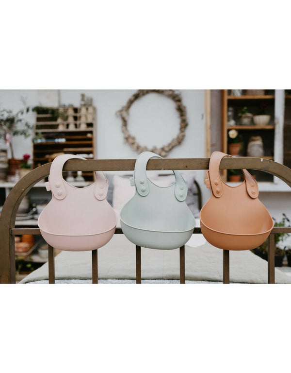 - Het slabbetje heeft een praktisch opvangbakje aan de voorkant om etensresten op te vangen