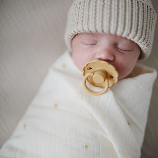 De FRIGG-fopspenenlijn van natuurrubber is zorgvuldig ontworpen voor het comfort van uw baby.